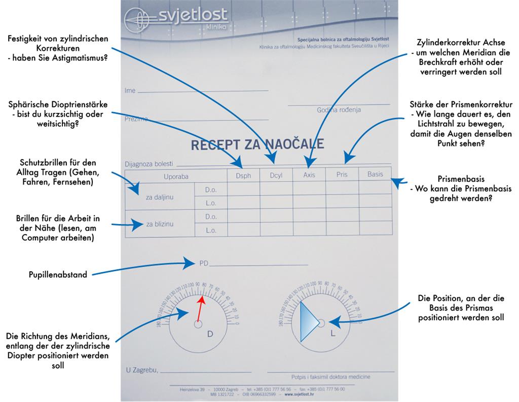 Das rechte Auge ist in Rezepten üblicherweise mit der lateinischen Abkürzung OD = oculus dexter und das linke Auge mit OS = oculus sinister gekennzeichnet. Die Abkürzungen in der kroatischen Sprache D.O. - rechtes Auge und L.O. - linkes Auge, sind irgendwo leicht zu finden anstelle von lateinischem OD und OS.