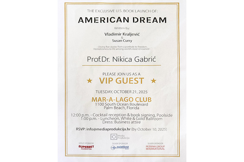 Prof. dr. sc. Nikica Gabrić, ugledni oftalmolog i osnivač Specijalne bolnice Svjetlost i dr. Krešimir Gabrić bili su počasni gosti na ekskluzivnom predstavljanju knjige „American Dream“ autora Vladimira Kraljevića i Susan Curry, održanom u prestižnom Mar-a-Lago Clubu u Palm Beachu na Floridi.