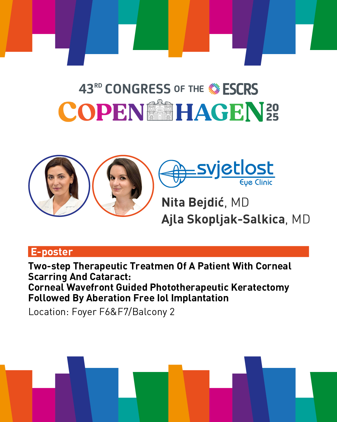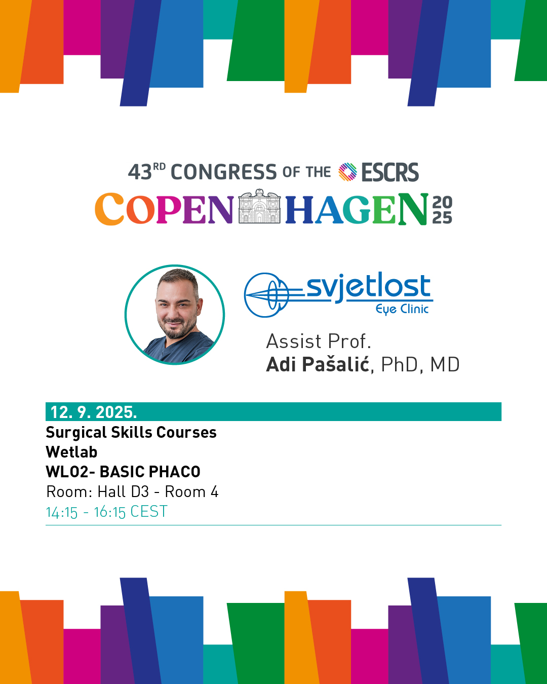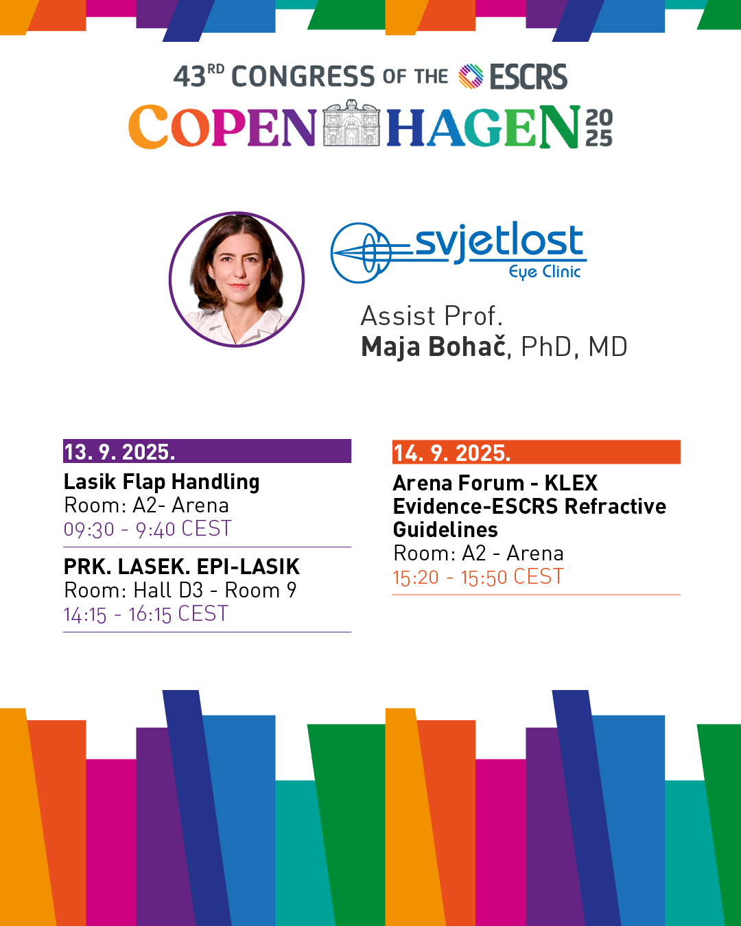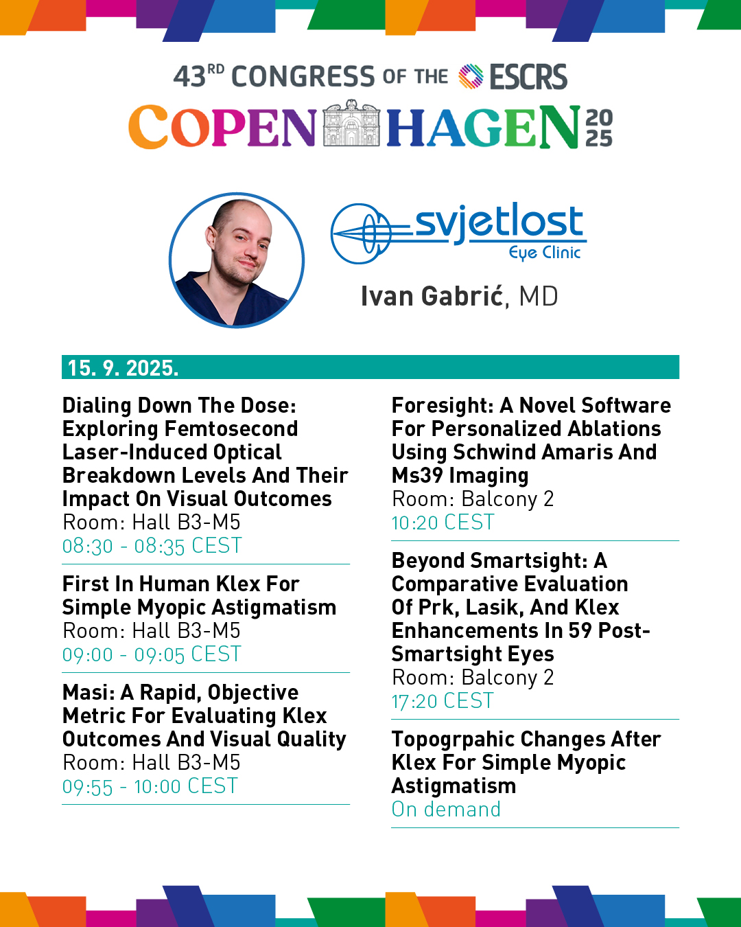 Na ovogodišnjem kongresu, tim istaknutih oftalmologa iz Klinike Svjetlost: dr. Ivan Gabrić, doc. dr. sc. Maja Bohač, dr. Krešimir Gabrić, dr. Ante Barišić, doc. dr. sc. Adi Pašalić, dr. Mateja Jagić, dr. Nita Bejdić i dr. Ajla Skopljak Salkica predstavit će najnovija dostignuća i inovacije u području refraktivne kirurgije.