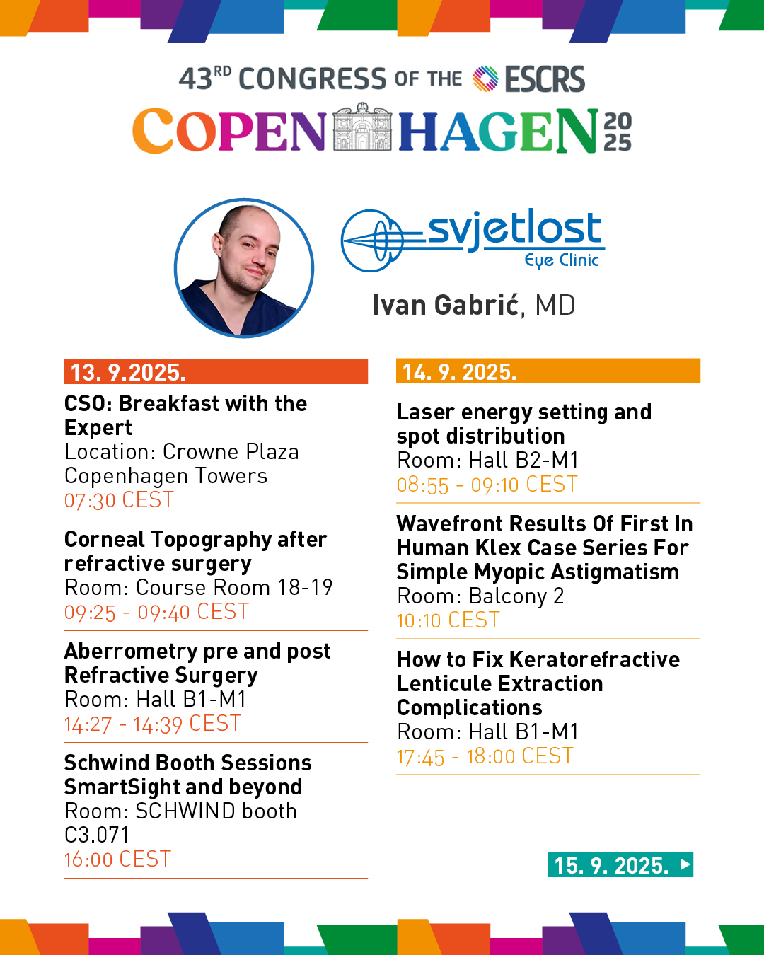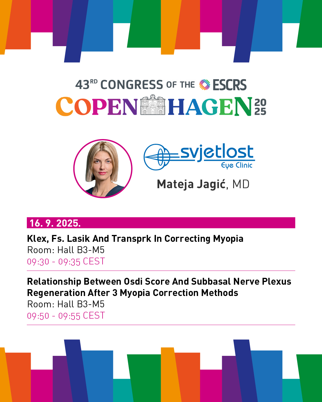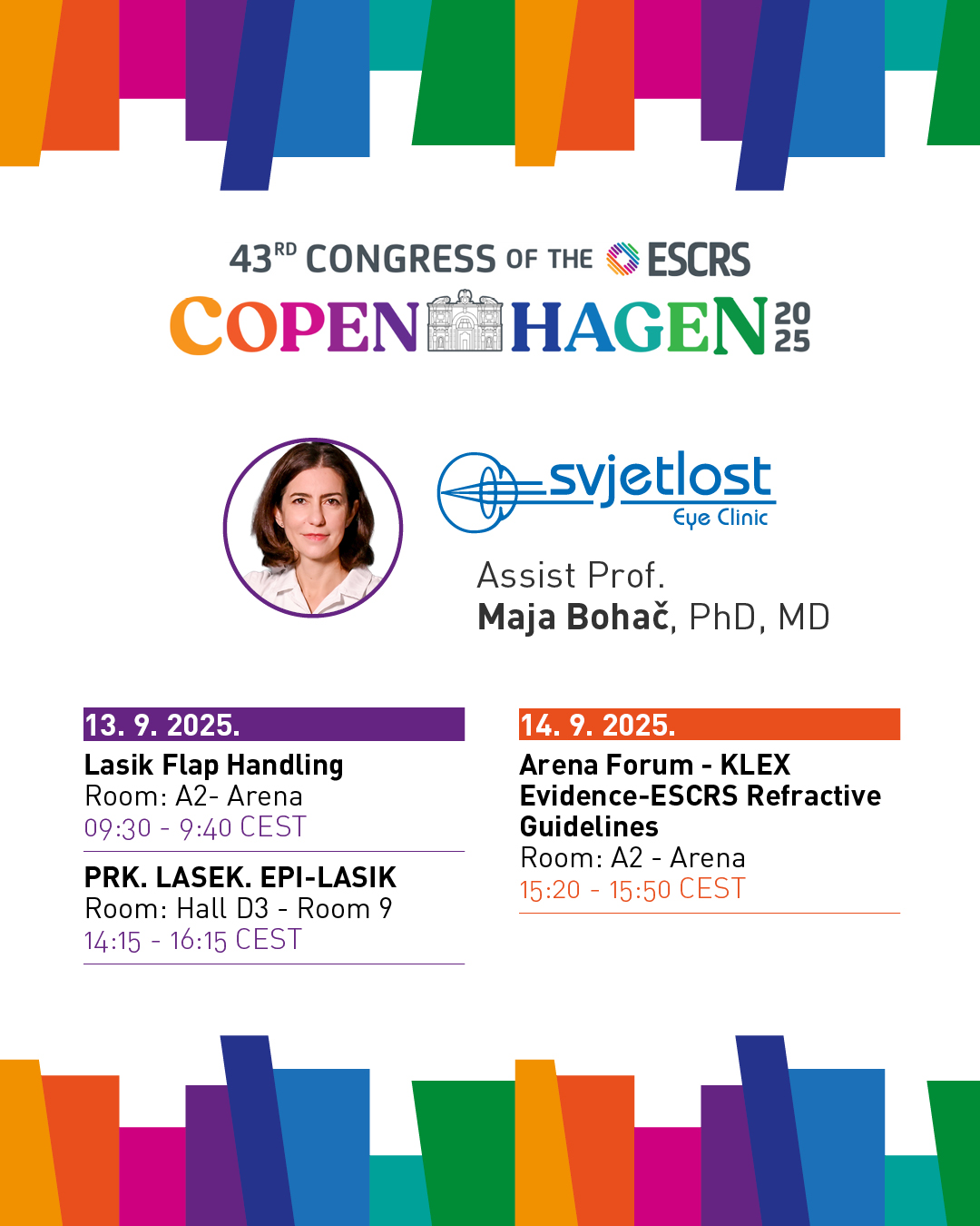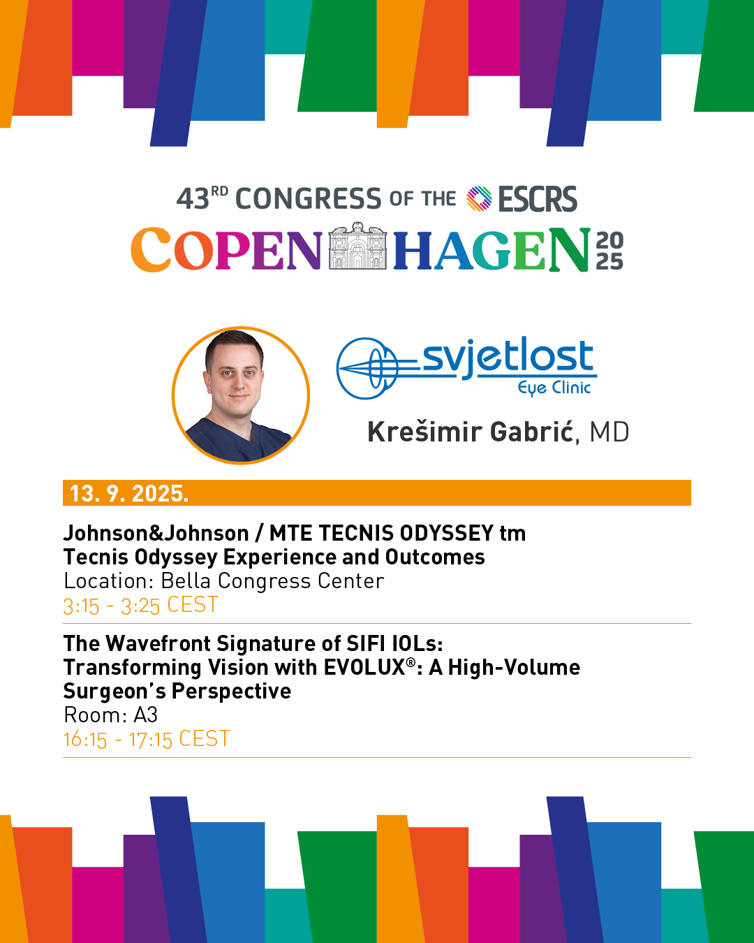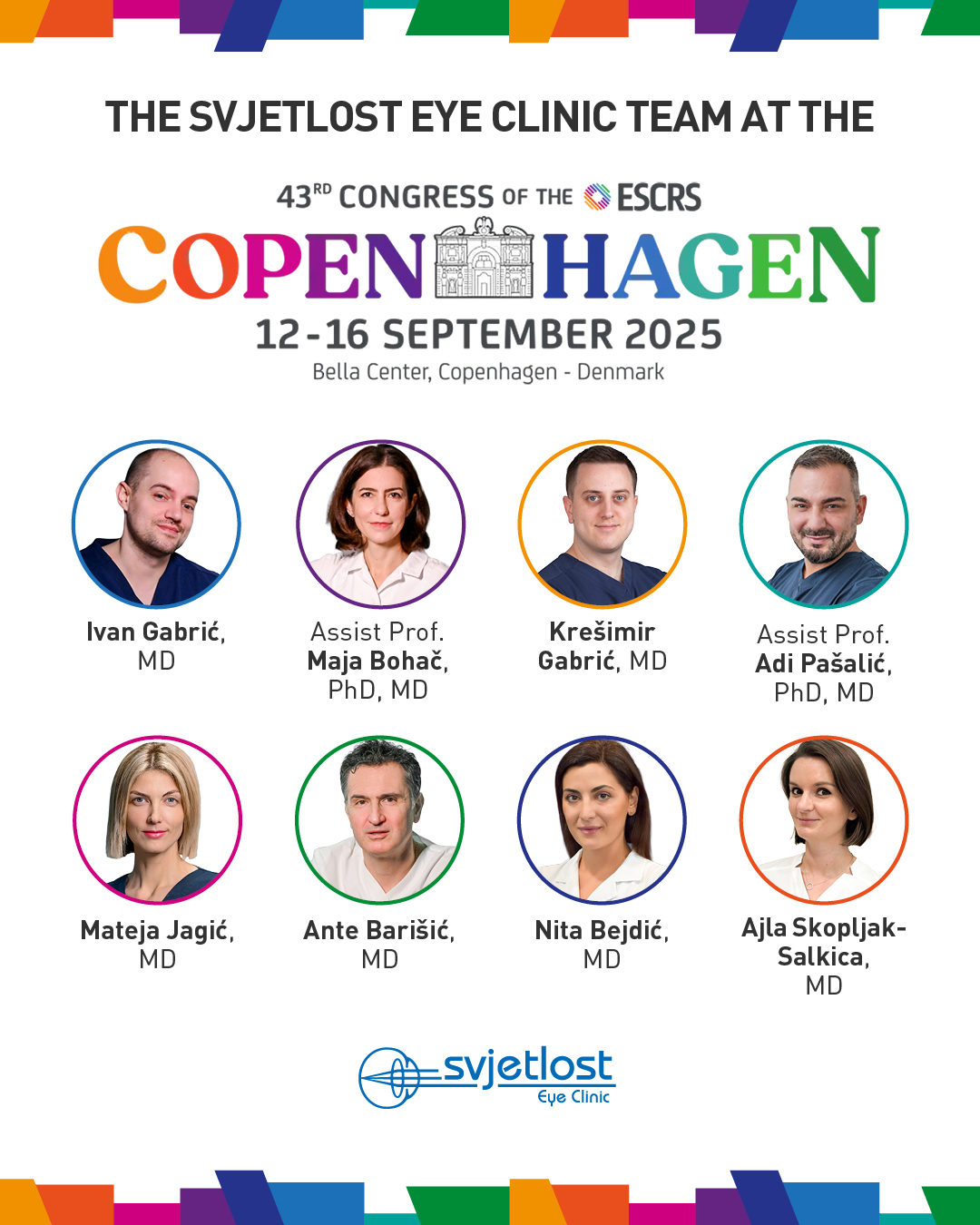 This year, Svjetlost doctors: Dr. Ivan Gabrić, Assoc. Prof. Dr. Maja Bohač, Dr. Krešimir Gabrić, Dr. Ante Barišić, Assoc. Prof. Dr. Adi Pašalić, Dr. Mateja Jagić, Dr. Nita Bejdić, and Dr. Ajla Skopljak Salkica will present the latest advancements and innovations in refractive surgery.